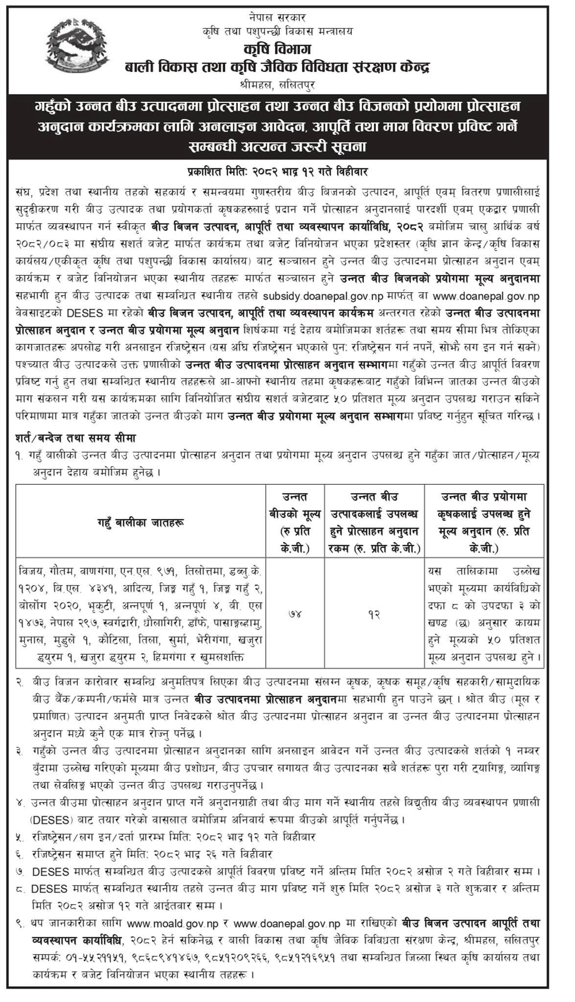 गहुँको उन्नत बीउ उत्पादनमा प्रोत्साहन तथा उन्नत बीउ बिजनको प्रयोगमा प्रोत्साहन अनुदान कार्यक्रमका लागि अनलाईन आवेदन, आपूर्ति तथा माग प्रविष्ट गर्ने सम्बन्धीको सूचना
