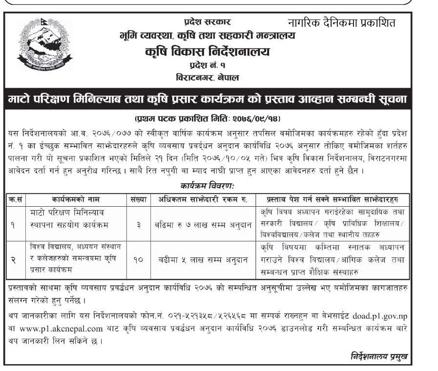 कृषि विकास निर्देशनालय बिराटनगरको कृषि व्यवसाय प्रवर्द्धन अनुदान कार्यक्रमको प्रस्ताव आव्हान सम्बन्धी सूचना