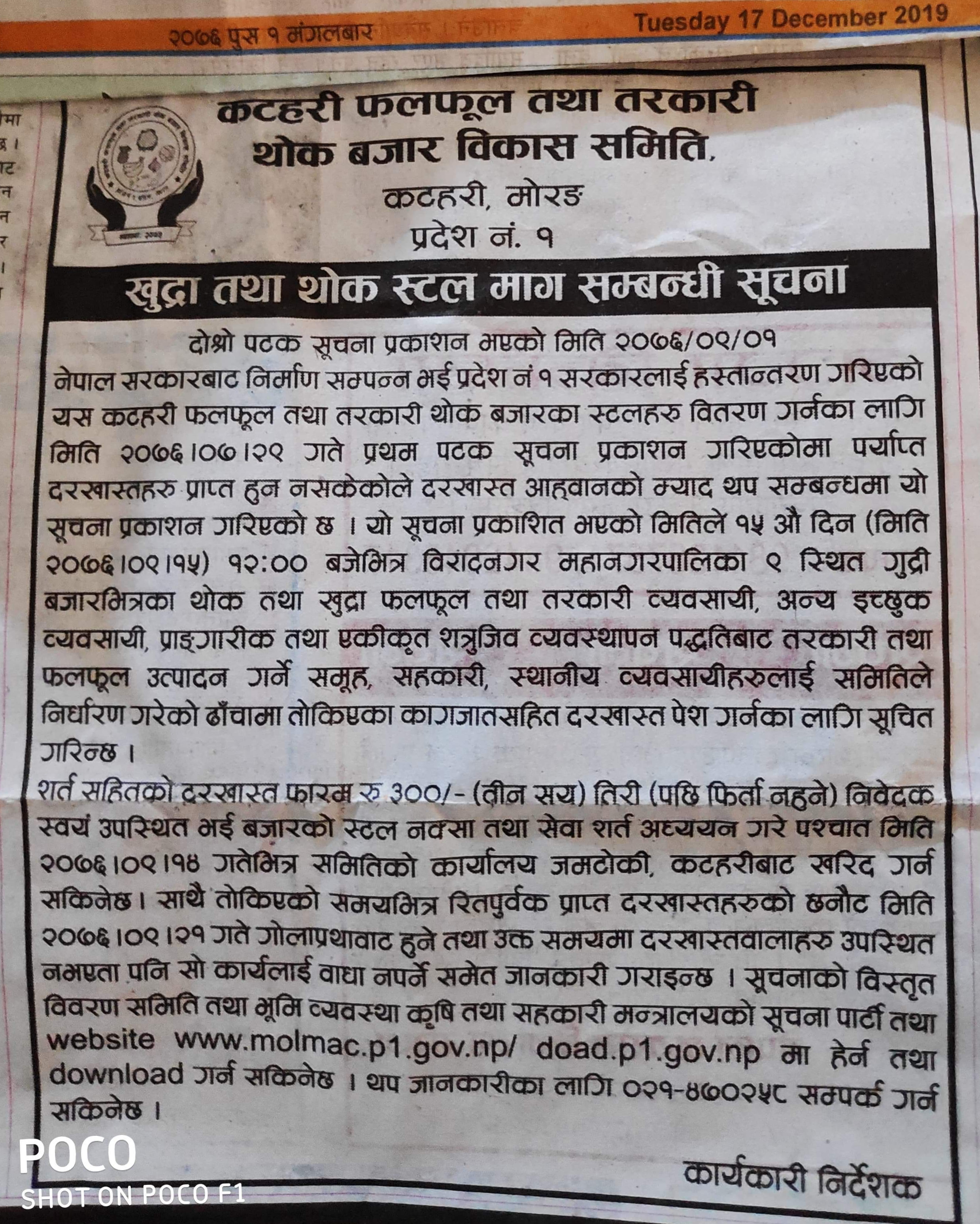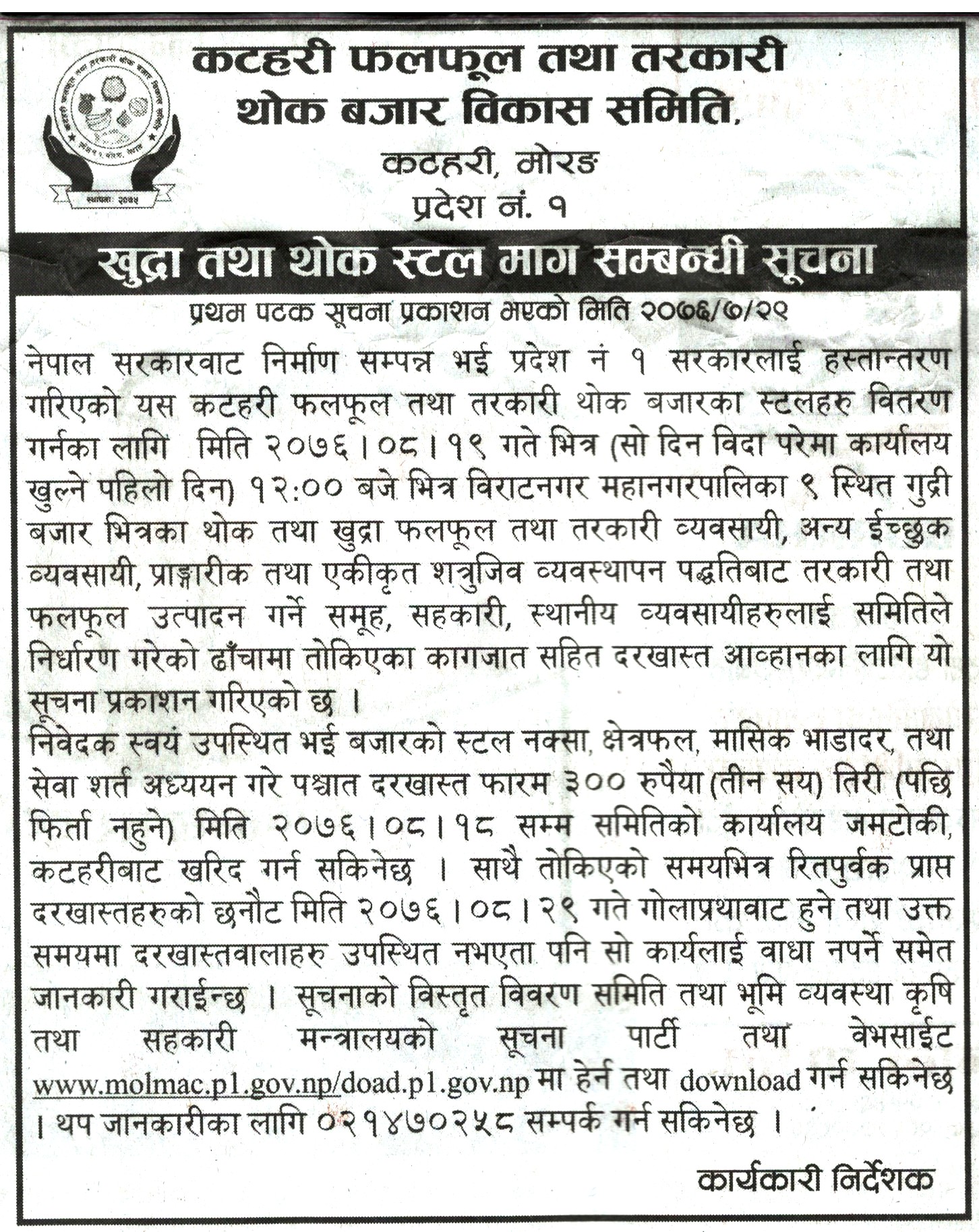 कटहरी फलफूल तथा तरकारी बजारको थोक तथा खुद्रा तथा थोक स्टल माग सम्बन्धी पुन सुचना