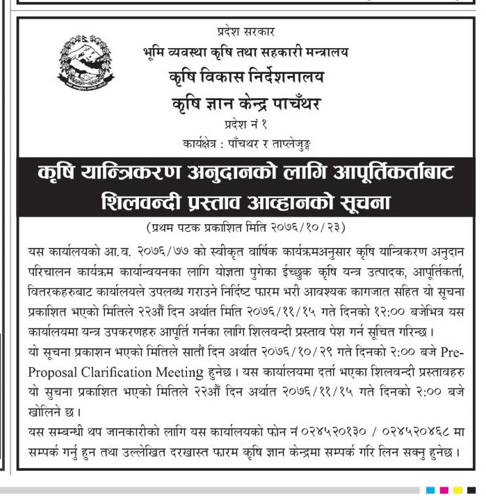 कृषि यान्त्रिकरण अनुदानको लागि आपूर्तिकर्ताबाट शिलवन्दी प्रस्ताव आव्हानको सूचना, पाँचथर(अन्नपूर्णपोष्ट २०७६/१०/२३)