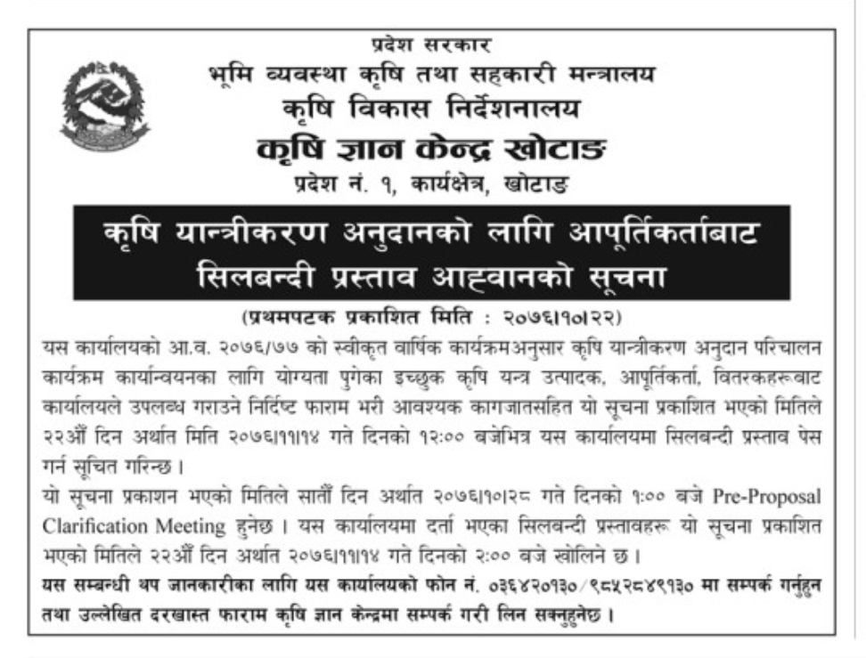 कृषि यान्त्रिकरण अनुदानको लागि आपूर्तिकर्ताबाट शिलवन्दी प्रस्ताव आव्हानको सूचना, खोटाङ्ग(गोरखापत्र २०७६/१०/२२)