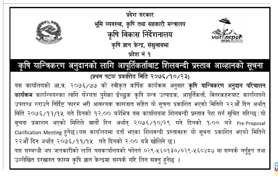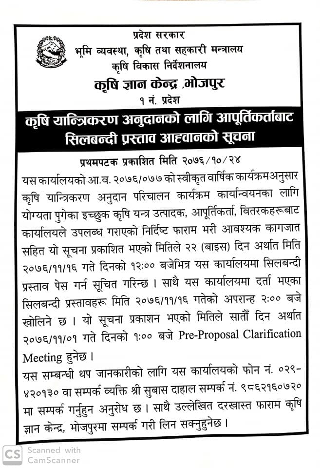 कृषि यान्त्रिकरण अनुदानको लागि आपूर्तिकर्ताबाट शिलवन्दी प्रस्ताव आव्हानको सूचना, भोजपुर(गोरखापत्र २०७६/१०/२४)