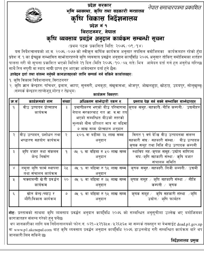 कृषि विकास निर्देशनालय बिराटनगरको कृषि व्यवसाय प्रवर्द्धन अनुदान कार्यक्रमको प्रस्ताव आव्हान सम्बन्धी सूचना